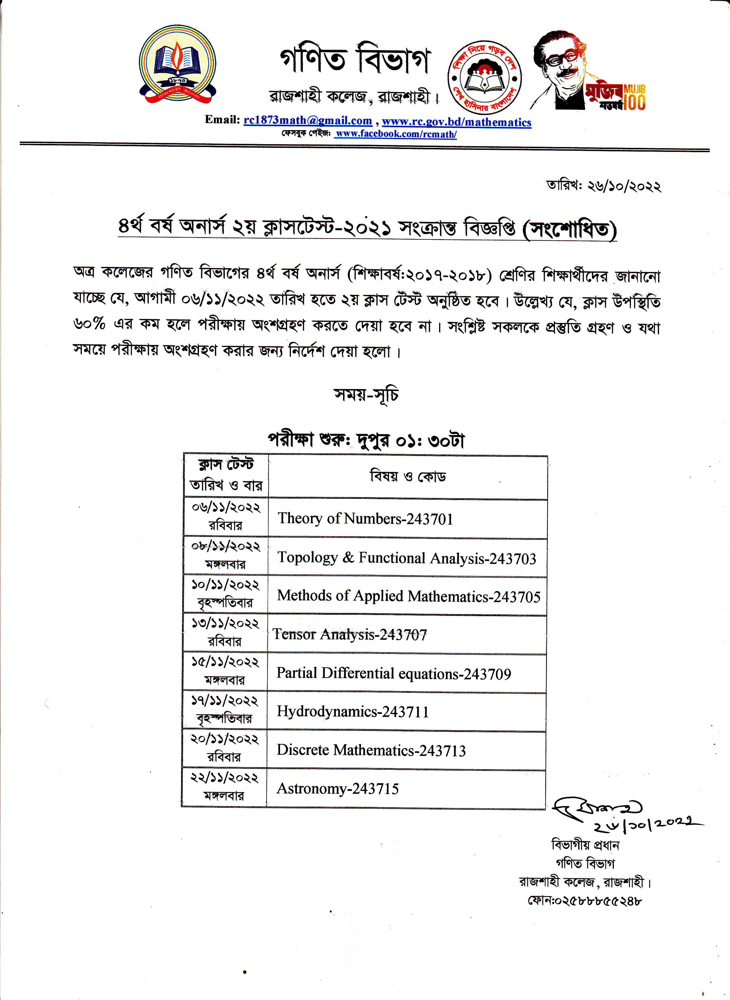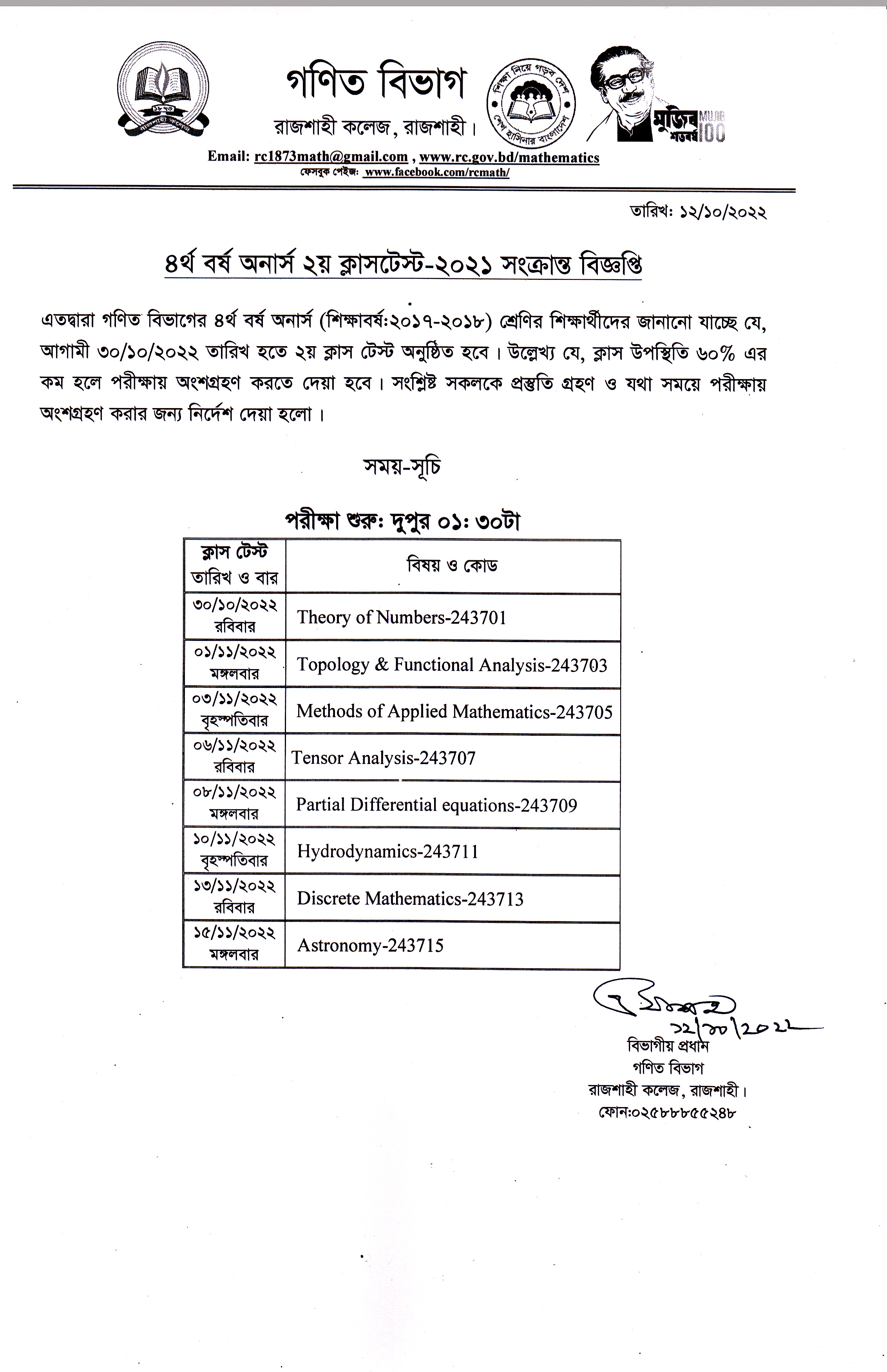 | অনার্স ৪র্থ বর্ষ (১৩-১৪) এর ২য় ক্লাস টেস্ট-২০১৭ এর সময় সূচি | 10-10-2017 | Download |