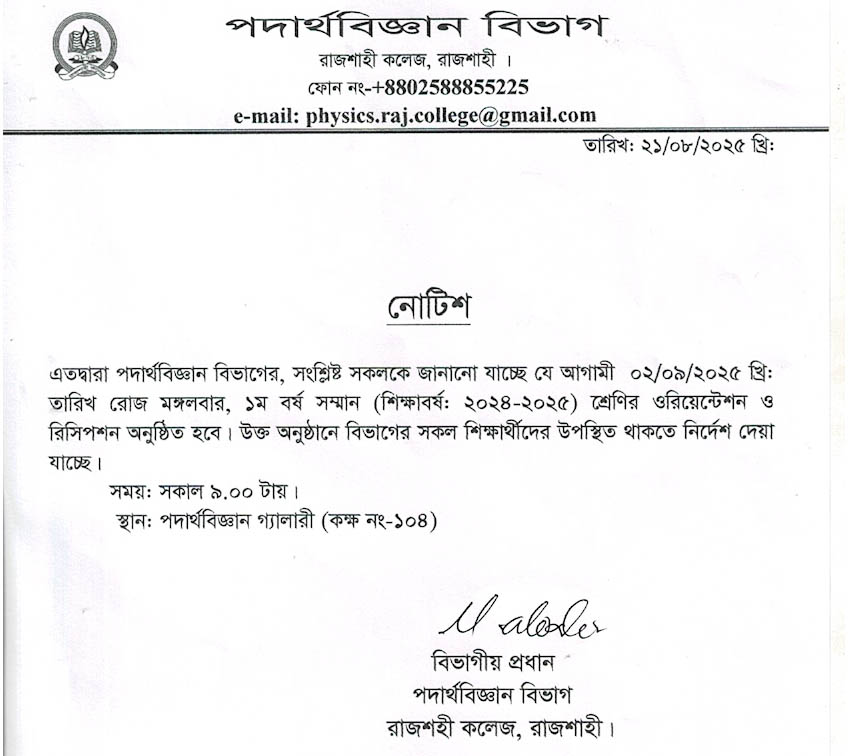 | পদার্থবিজ্ঞান বিভাগের বিভাগীয় প্রধানের বিদায় সংবর্ধনা নোটিশ | 25-06-2024 | Download |