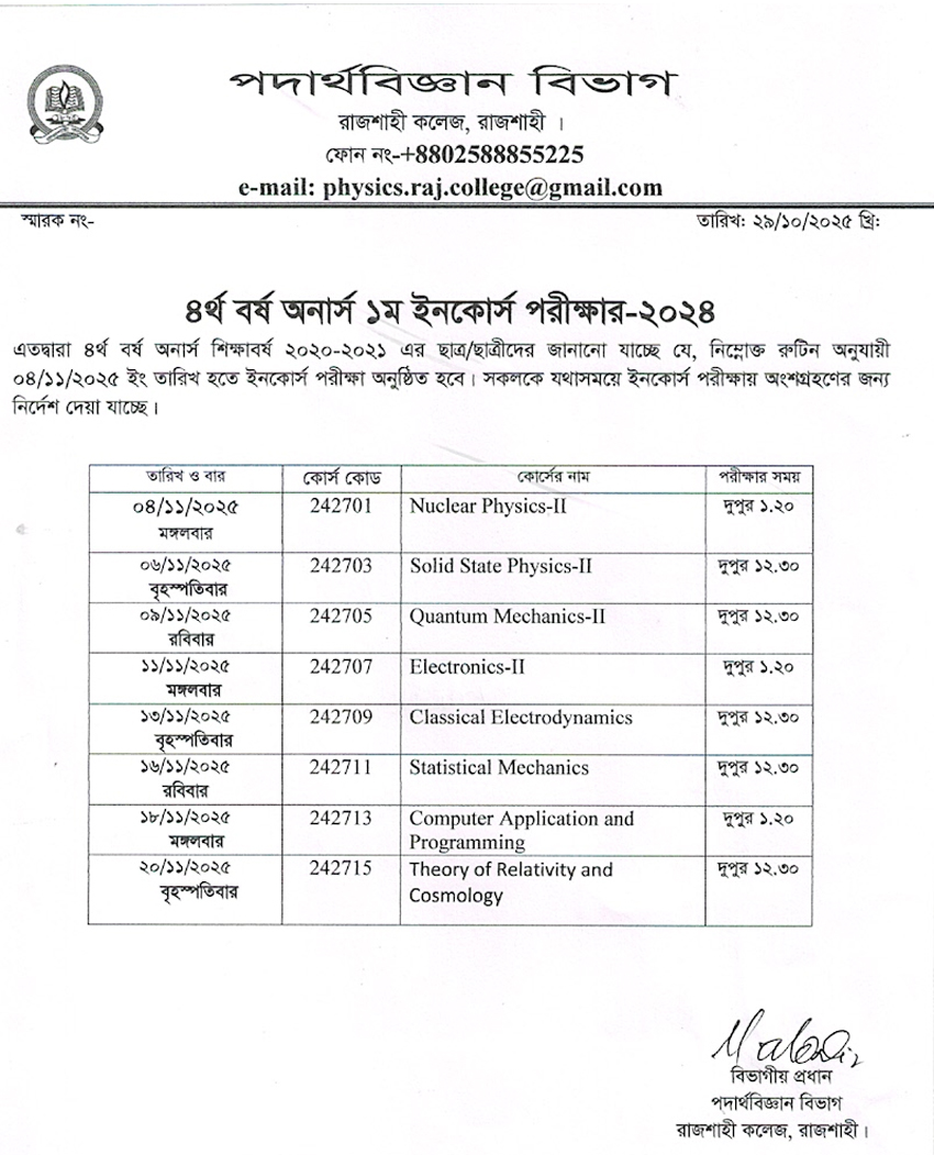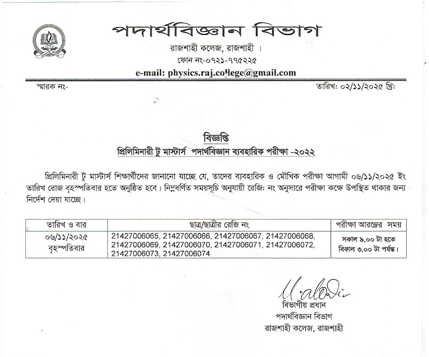 | ১ম বর্ষ অনার্স পদার্থবিজ্ঞান ব্যবহারিক পরীক্ষা-2024 এর নোটিশ | 05-11-2025 | Download |